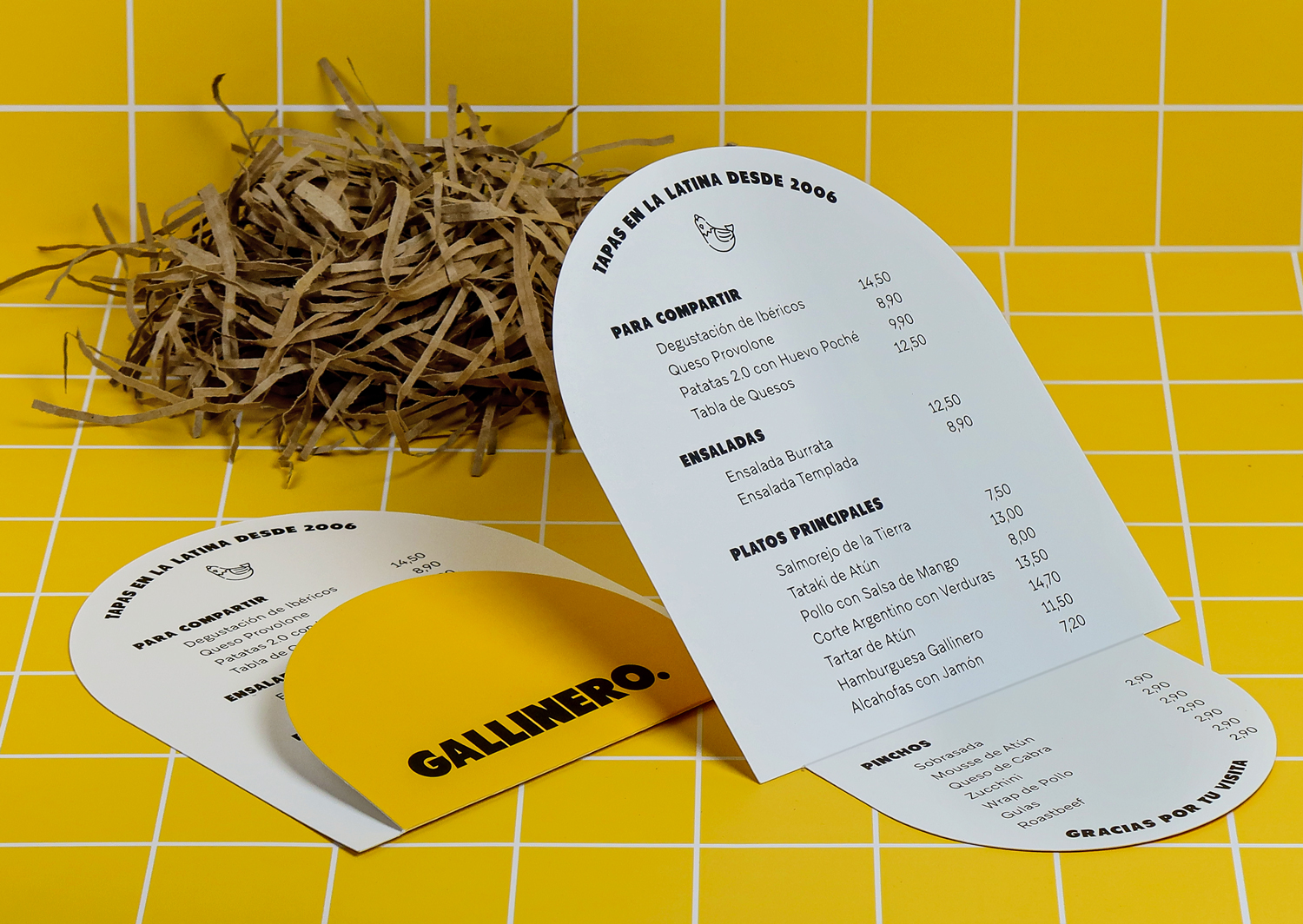 Diseño carta restaurante huevo para Gallinero, un bar de tapas en La Latina, Madrid. La carta es el elemento central de este proyecto y debía ser funcional, resistente y memorable. Por eso se creó una carta de restaurante plegada en forma de huevo, un guiño al nombre del local y a su personalidad cercana.