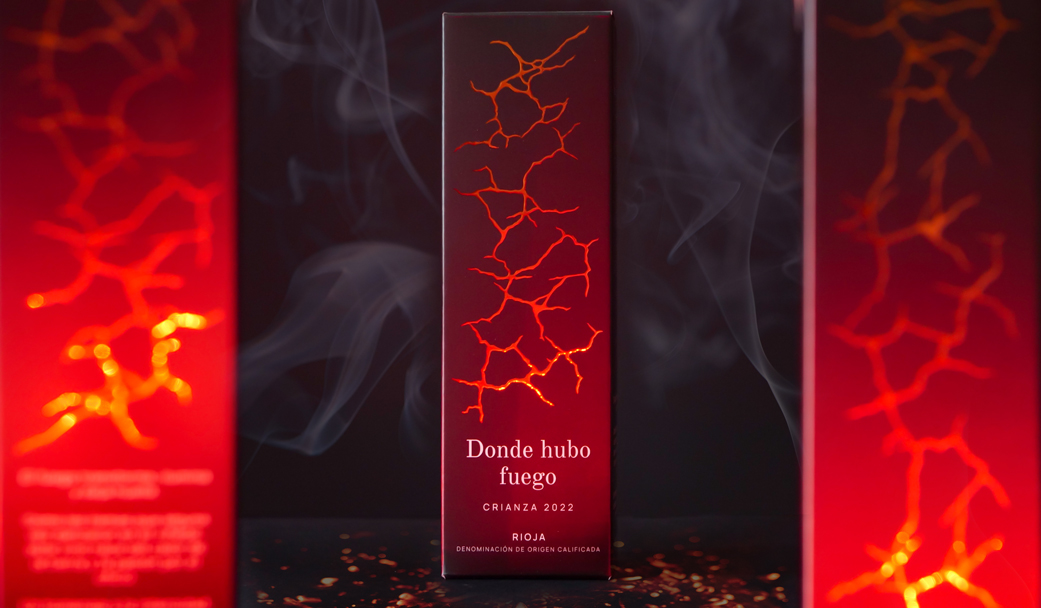 El packaging también juega un papel protagonista. La caja portabotellas reproduce el concepto visual de la etiqueta mediante un estampado cobre en forma de grietas de fuego o carbón, generando una experiencia sensorial completa desde el primer contacto.